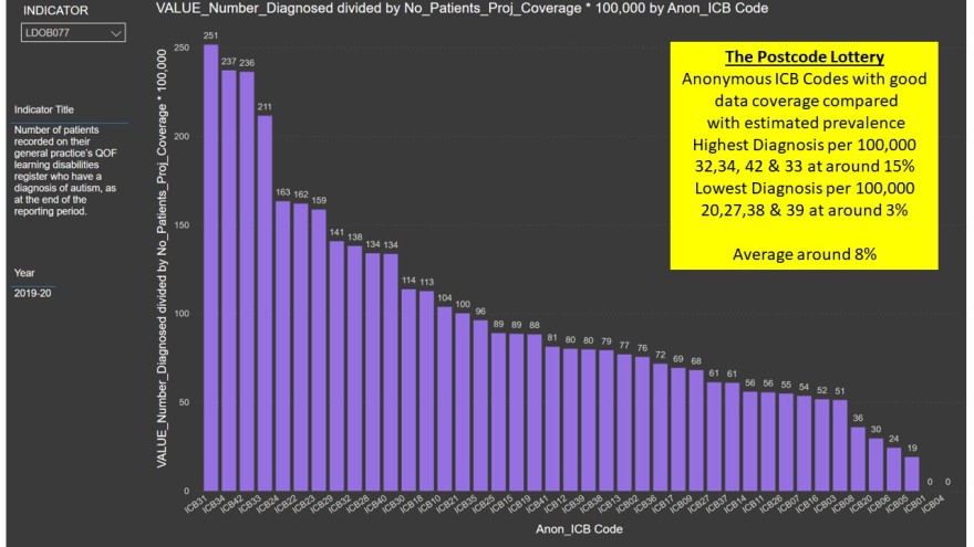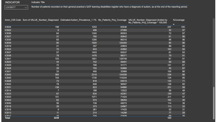In the initial Power BI model, we scrutinized the count of autism diagnoses among children aged 0-9 in England for the fiscal year 2019-20, dissecting the performance of Integrated Care Boards (ICBs) across the nation. The analysis highlighted significant variations in ICB performance, shedding light on the regional landscape of autism diagnoses. It is crucial to acknowledge that the data's novelty and experimental nature introduced variability in the coverage of General Practitioner (GP) Practices, prompting us to utilize a coverage report from NHS England for compensation. Nevertheless, the model's accuracy remains contingent on the level of coverage.