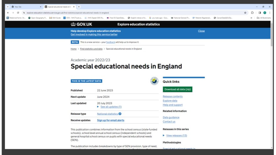 The following visuals show the numbers and trends relating to special educational needs in England focusing on Autism (ASD) Profound and Multiple Learning Disabilities (PMLD), Moderate Learning Difficulties (MLD), and Severe Learning Difficulties (SLD)