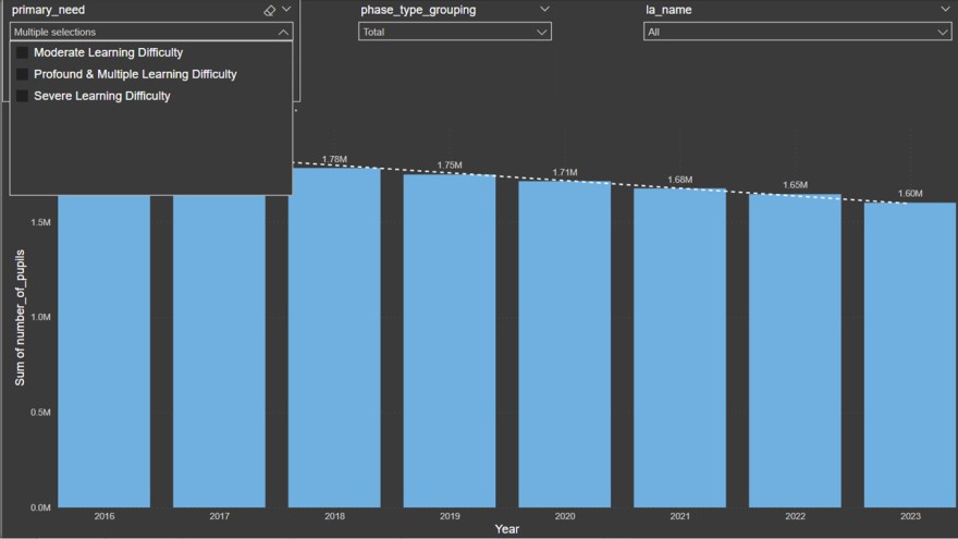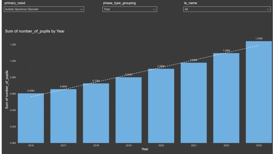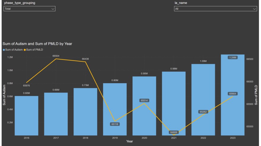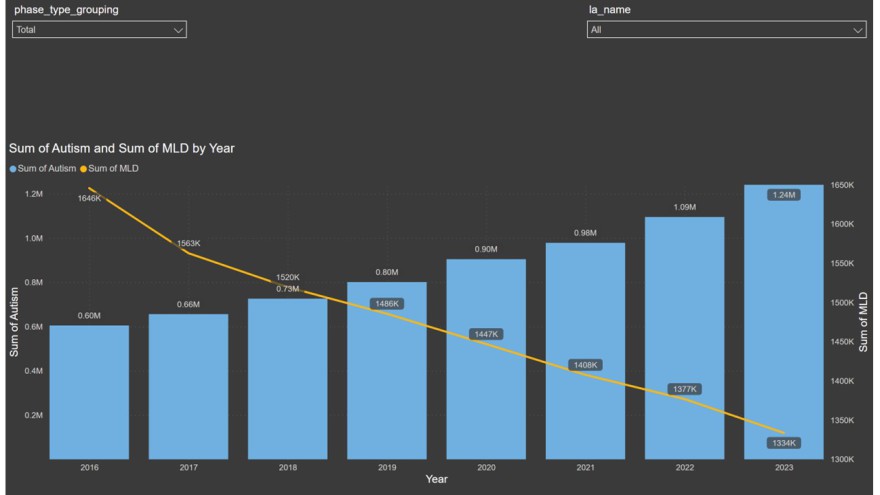 Our choice of the 2019-20 timeframe was deliberate, predating the onset of COVID, which had the potential to disrupt diagnosis programs. This disruption was evident in the second Power BI model, where we delved into autism diagnoses and associated conditions such as Profound and Multiple Learning Disabilities (PMLD), Moderate Learning Difficulties (MLD), and Severe Learning Difficulties (SLD) using Special Educational Needs statistics from GOV.UK. While autism diagnoses exhibited a consistent upward trend from 2016 to 2023, PMLD + SLD + MLD, ostensibly correlating with autism at 60% to 70%, demonstrated a decline over the same period.